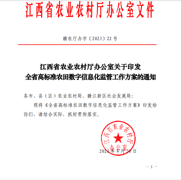 等信息“一张图”管理。图为:江西省农业农村厅办公室关于印发 全省高标准农田数字信息化监管工作方案的通知
